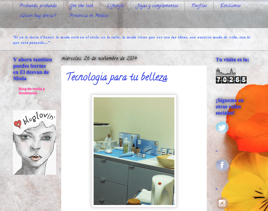 - Fondos estampados, variedad de colores, letras, fotos, texturas. Ruido. Todo esto despista al lector (o incluso lo espanta). El ejemplo que os pongo es de una de las 12 blogueras de moda que marcan tendencia en España, según El Mundo. Me vale de muestra para que veáis a qué me refiero en este punto y en el que hablo sobre la tipografía.