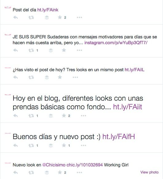 - No tener un plan. Esto se nota porque está la ley del difundir por difundir, y casi siempre son fotos de los looks y post, uno de tras de otro. “Visita mi web” “Mira mi look” «Post del día» “Mira mis zapatos” “Mi viaje a NY”. Establece objetivo, planifica publicaciones y obtendrás resultados.
